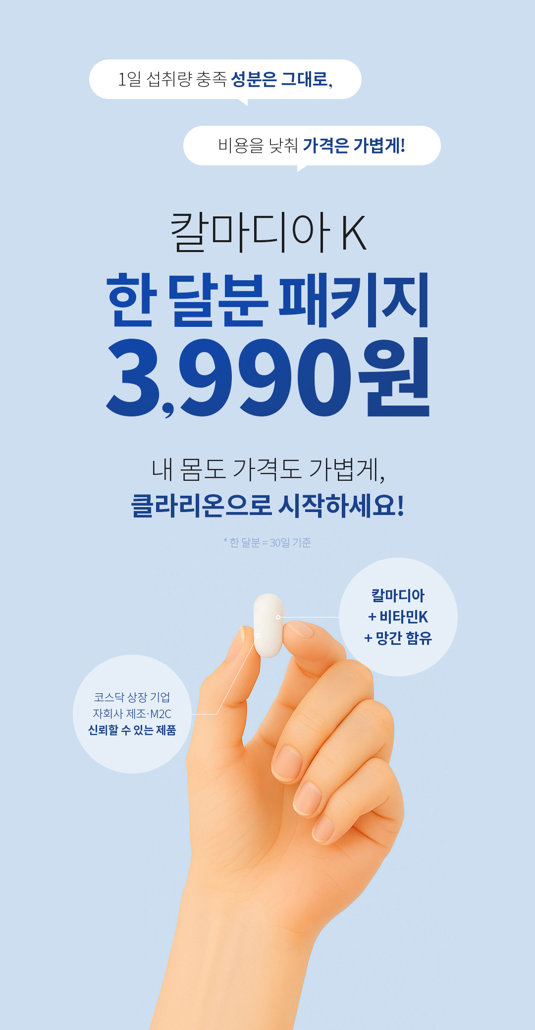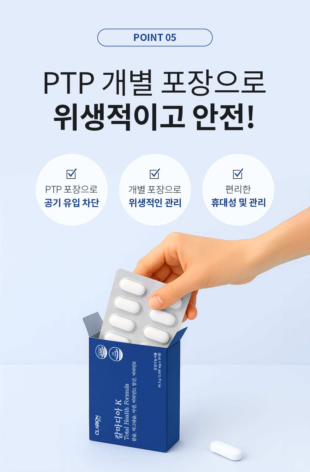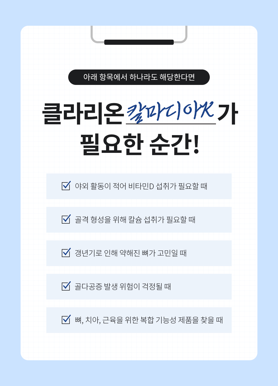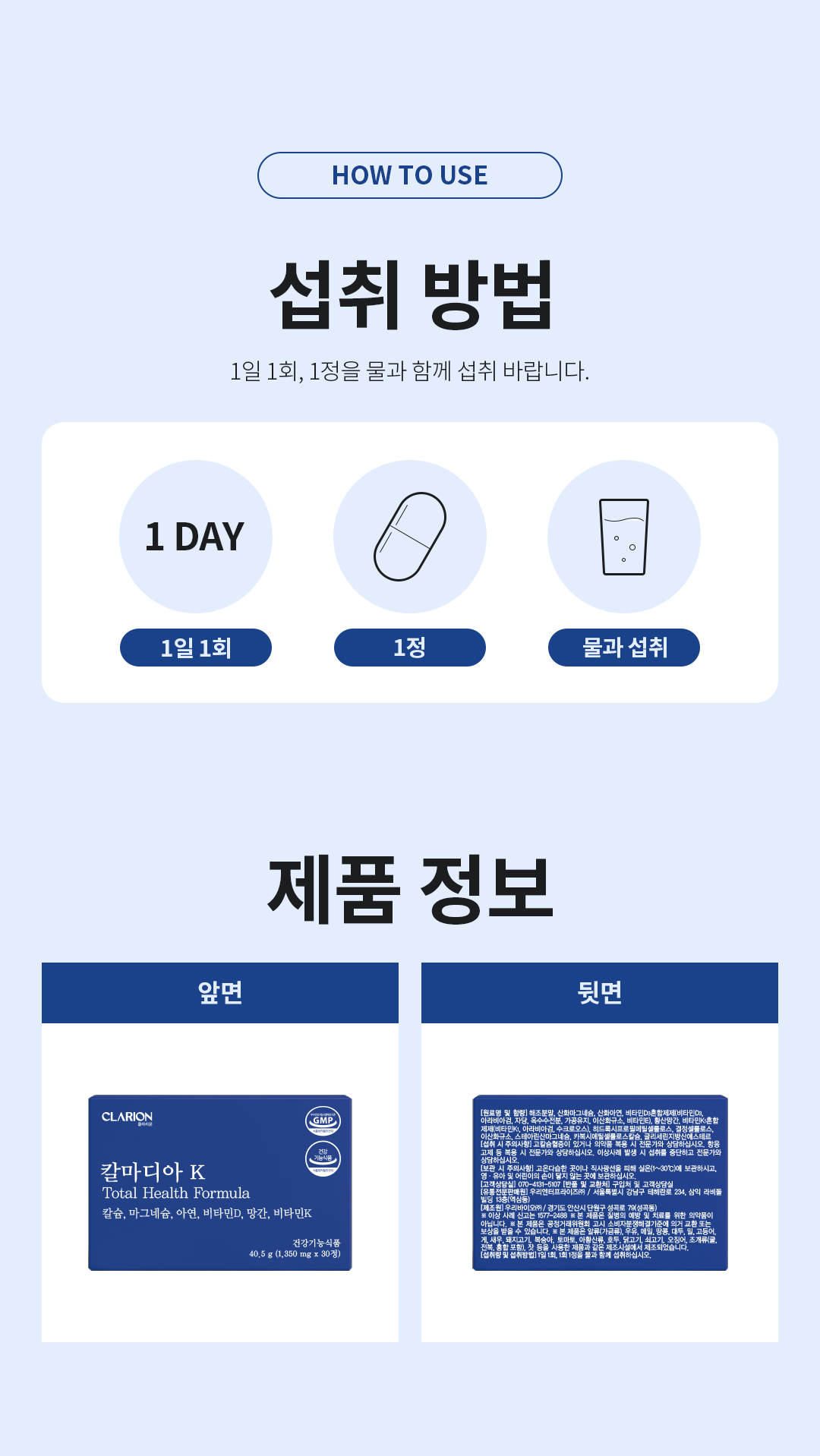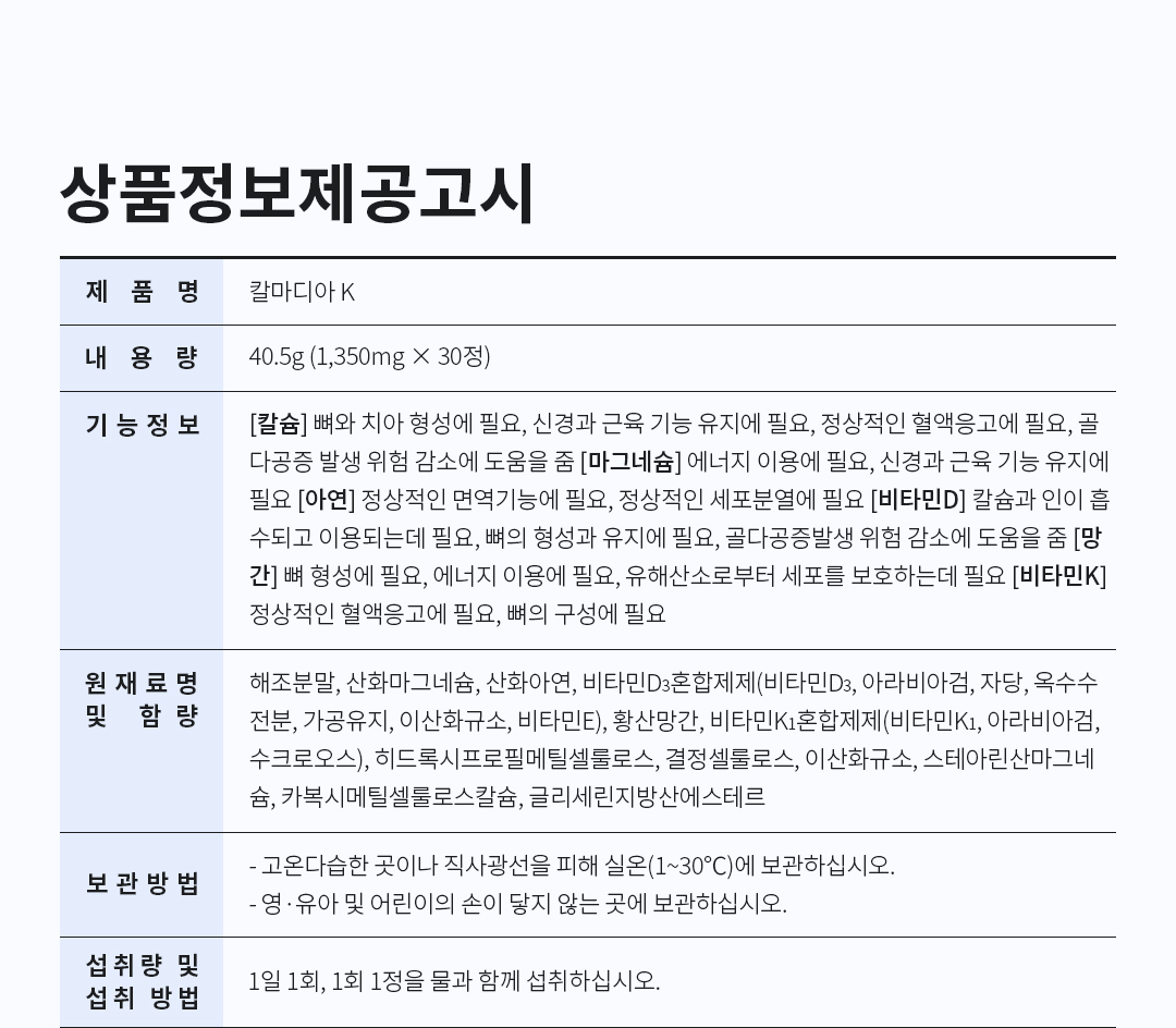 | 섭취량, 섭취방법 및 섭취 시 주의사항 및 부작용 가능성 | 1. 고칼슘혈증이 있거나 의약품 복용 시 전문가와 상담하십시오. 2. 항응고제 등 복용 시 전문가와 상담하십시오. 3. 이상사례 발생 시 섭취를 중단하고 전문가와 상담하십시오. | ||