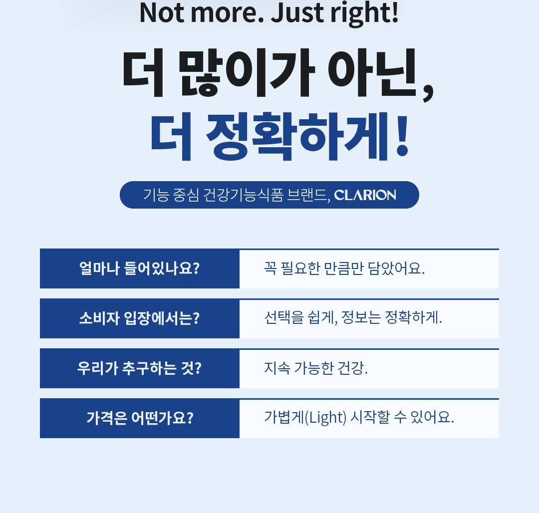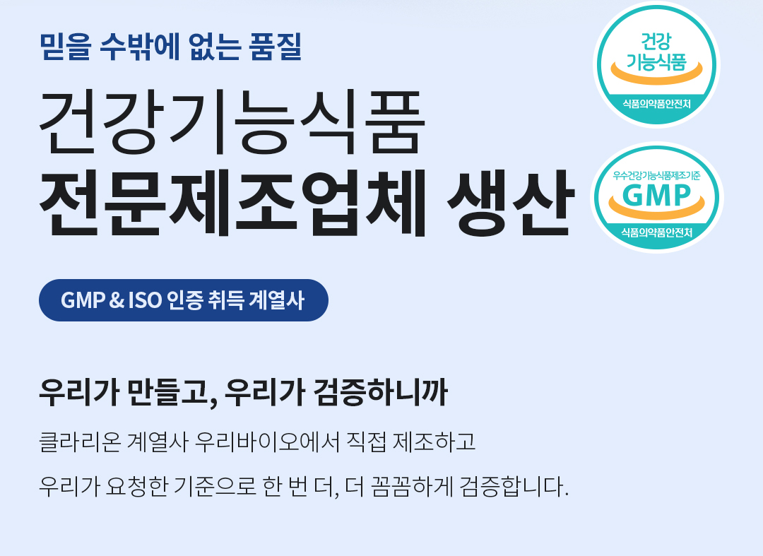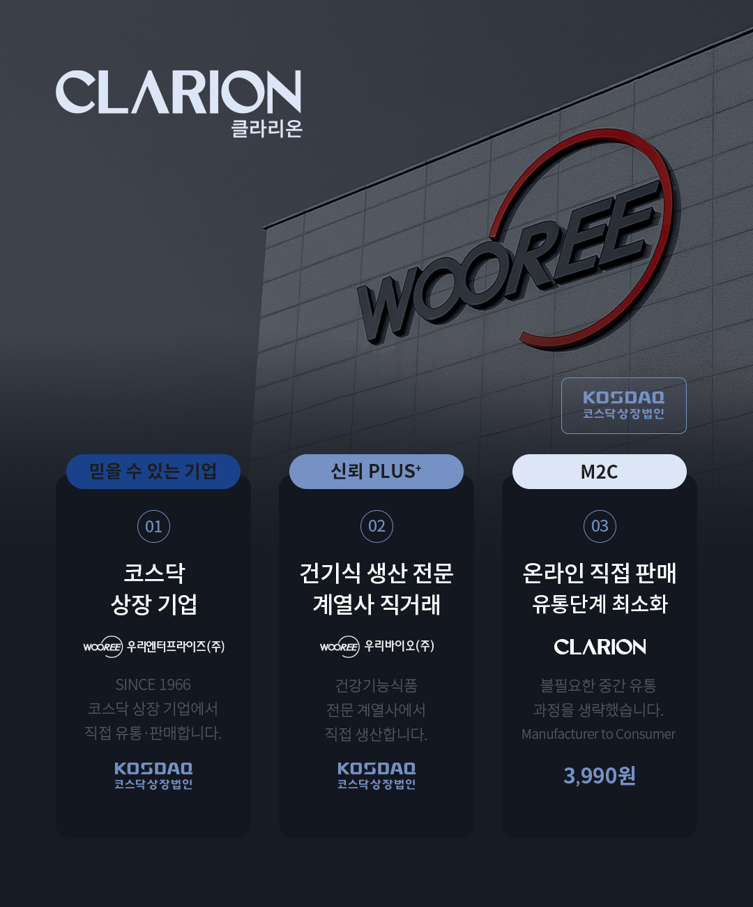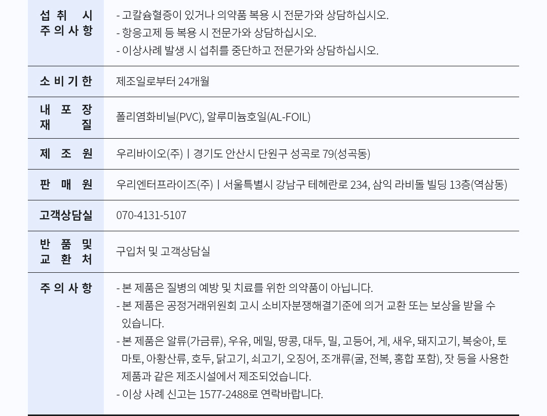 | 소비자 안전을 위한 주의사항 | 1. 이상 사례 신고는 1577-2488 2. 본 제품은 질병의 예방 및 치료를 위한 의약품이 아닙니다. 3. 본 제품은 공정거래위원회 고시 소비자분쟁해결기준에 의거 교환 또는 보상을 받을 수 있습니다. 4. 본 제품은 알류(가금류), 메밀, 땅콩, 밀, 고등어, 게, 새우, 돼지고기, 토마토, 호두, 닭고기, 쇠고기, 오징어, 조개류(굴, 전복, 홍합 포함), 잣 등을 사용한 제품과 같은 제조시설에서 제조되었습니다. | ||