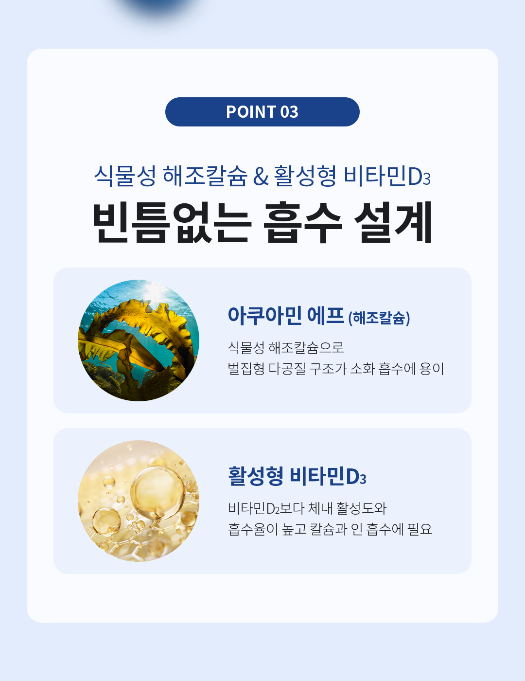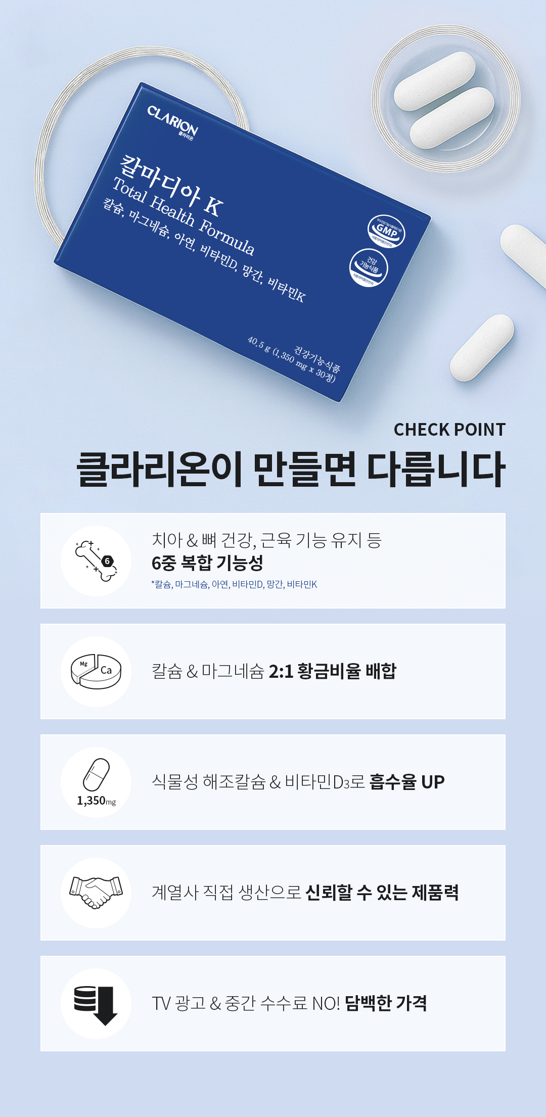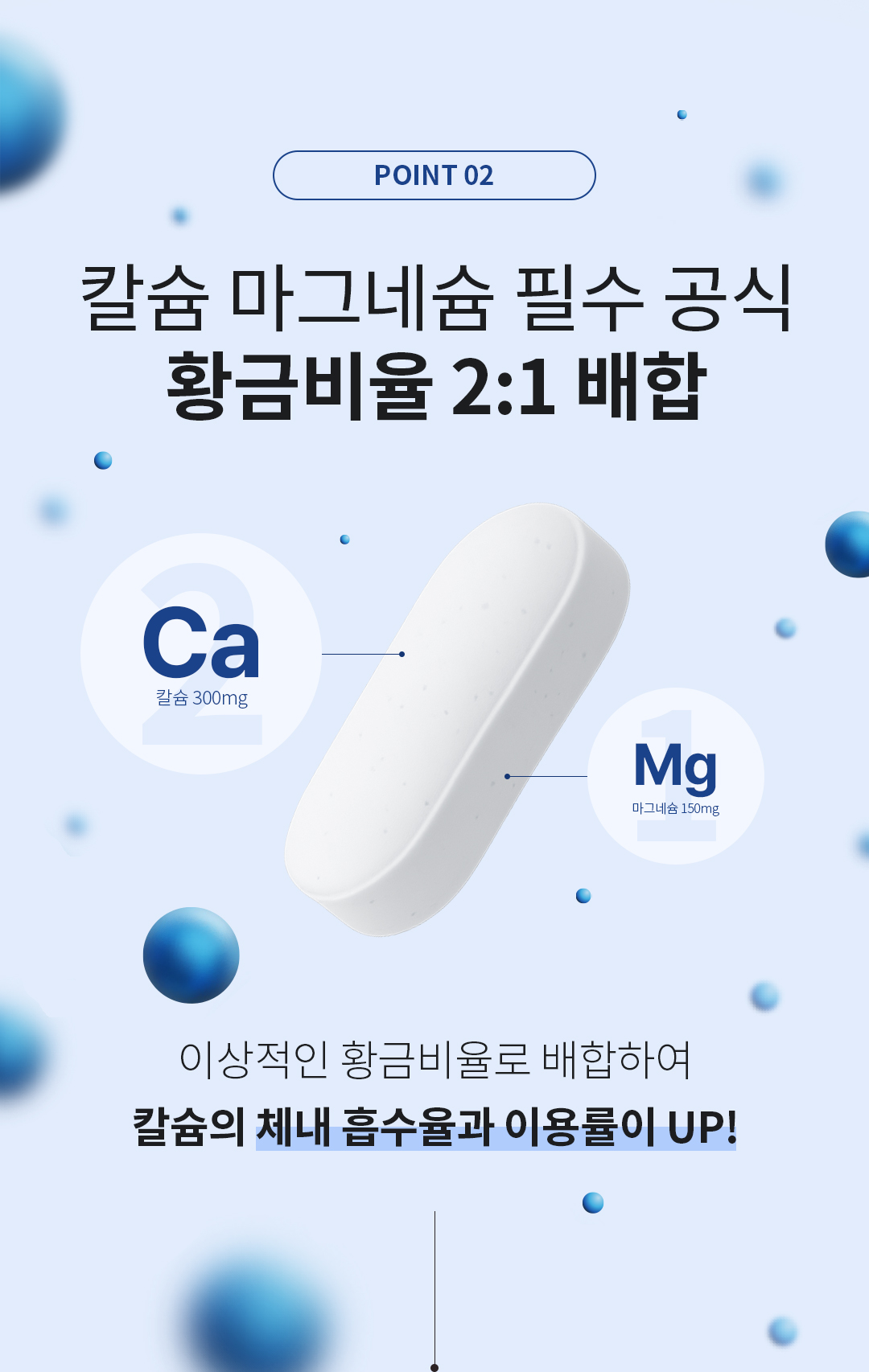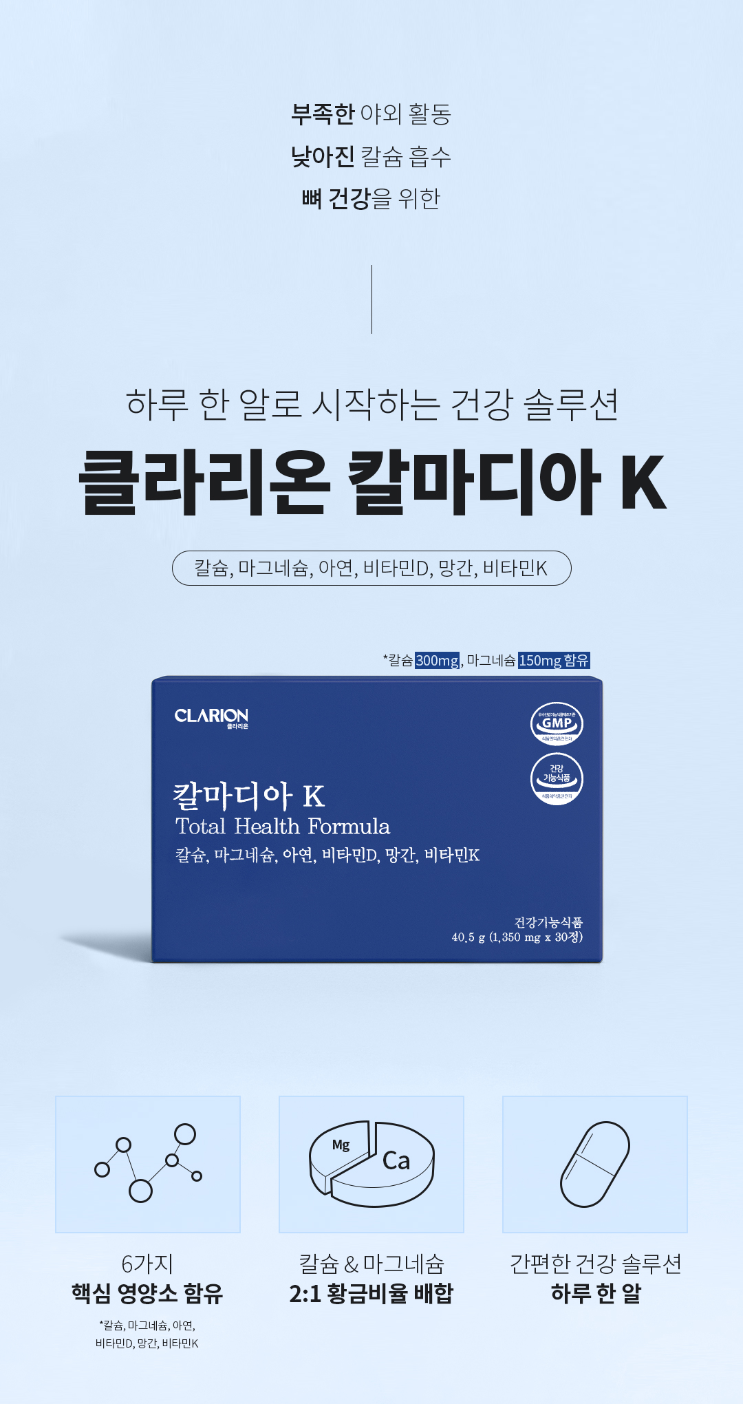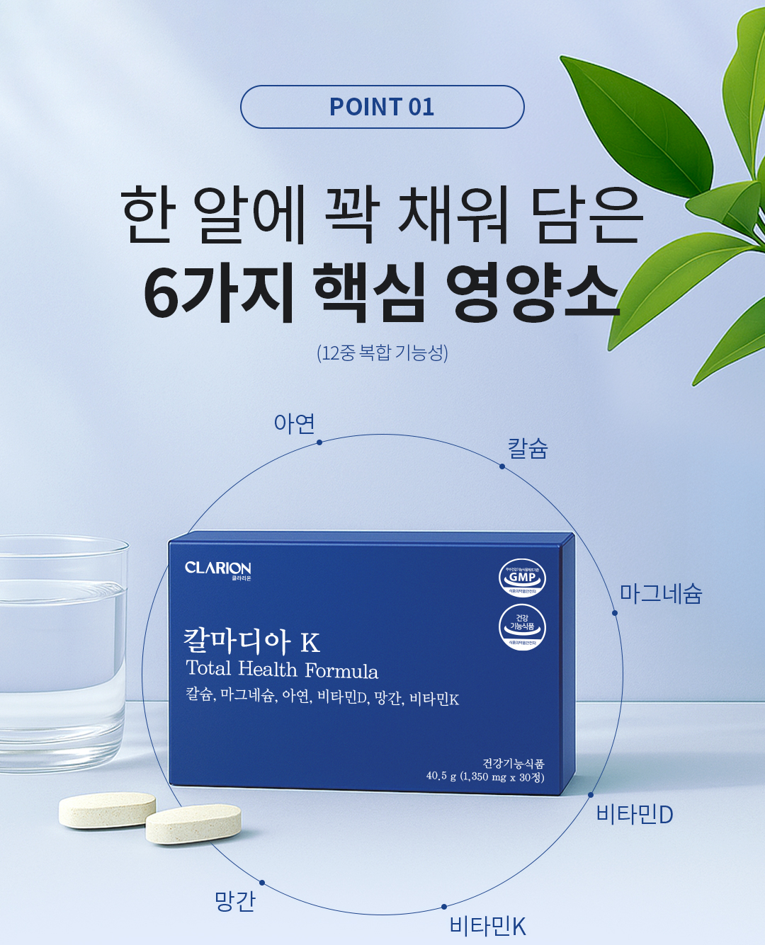 | 기능정보 | [칼슘] 뼈와 치아 형성에 필요, 신경과 근육 기능 유지에 필요, 정상적인 혈액응고에 필요, 골다공증 발생 위험 감소에 도움을 줌 [마그네슘] 에너지 이용에 필요, 신경과 근육 기능 유지에 필요 [아연] 정상적인 면역기능에 필요, 정상적인 세포분열에 필요 [비타민D] 칼슘과 인이 흡수되고 이용되는데 필요, 뼈의 형성과 유지에 필요, 골다공증발생 위험 감소에 도움을 줌 [망간] 뼈 형성에 필요, 에너지 이용에 필요, 유해산소로부터 세포를 보호하는데 필요 [비타민k] 정상적인 혈액응고에 필요, 뼈의 구성에 필요 | ||