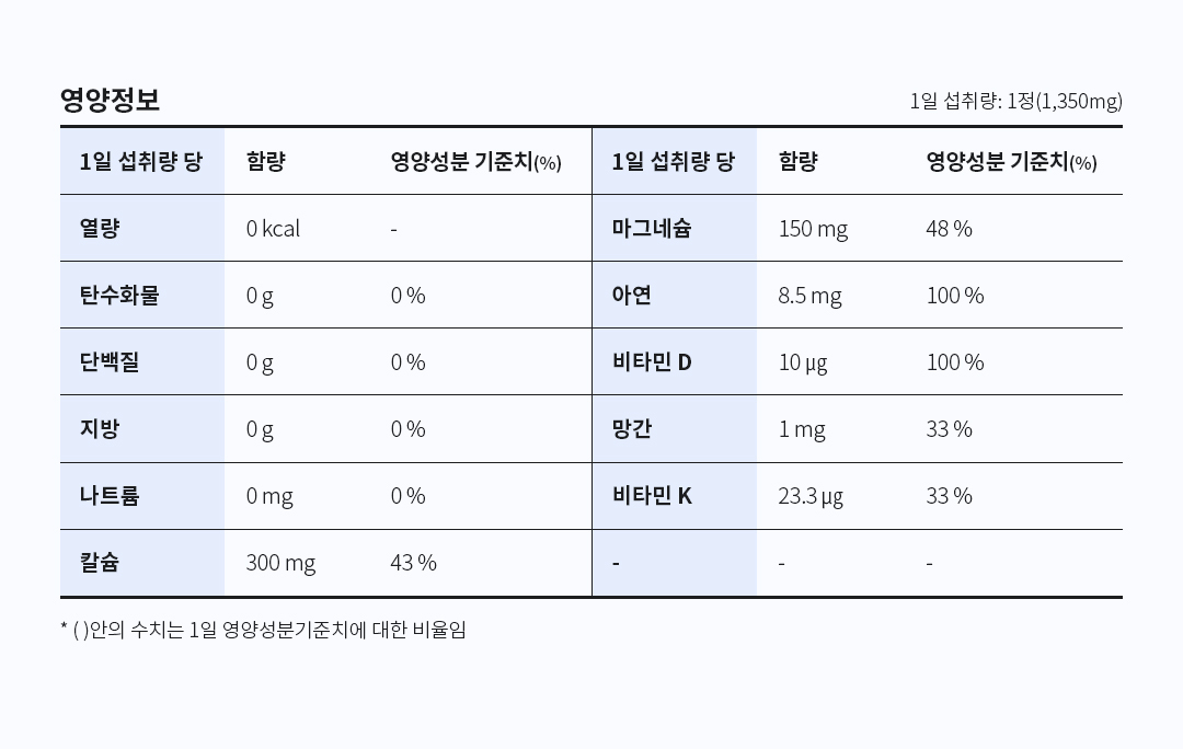 | 영양정보 | 열량 0 kcal, 탄수화물 1 g (0 %), 단백질 0 g(0 %), 지방 0 g(0 %), 나트륨 0 mg(0 %),칼슘 300mg(43%), 마그네슘 150mg(48%), 아연 8.5mg(100%), 비타민D 10㎍(100%), 망간 1mg(33%), 비타민K 23.3㎍(33%) ( )안의 수치는 1일 영양성분기준치에 대한 비율임 | ||