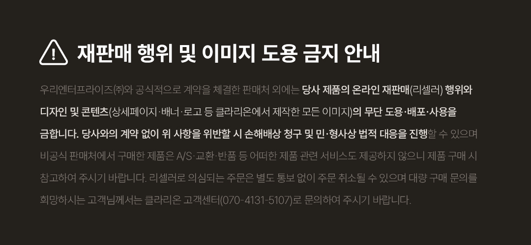 - 단순변심, 주문실수의 따른 교환/반품 신청은 상품 수령일로 부터 7일 이내 가능합니다.